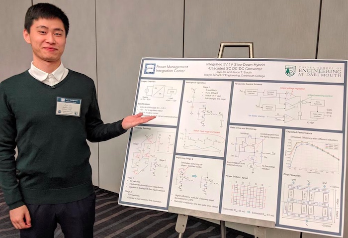 由 PMIC 博士資助 學(xué)生 Ziyu Xia 展示了他的項(xiàng)目“An Integrated 5:1 DC-DC converter”。圖片由 Andrila Hait 和達(dá)特茅斯大學(xué)提供
