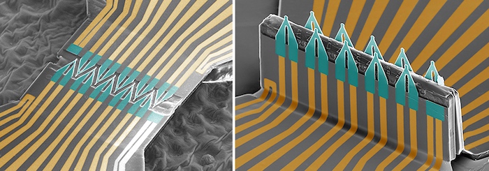 根據(jù)他們?cè)贜ature Nanotechnology上發(fā)表的文章,該團(tuán)隊(duì)首先將 FET 制造成 2D 形狀,將形狀的特定點(diǎn)粘合到預(yù)拉伸的彈性體片材上,然后松開(kāi)片材,從而構(gòu)建了 3D FET 陣列。這個(gè)過(guò)程導(dǎo)致了一個(gè)彎曲的器件,并導(dǎo)致 FET 折疊成一個(gè) 3D 陣列結(jié)構(gòu),可以很容易地穿透細(xì)胞。