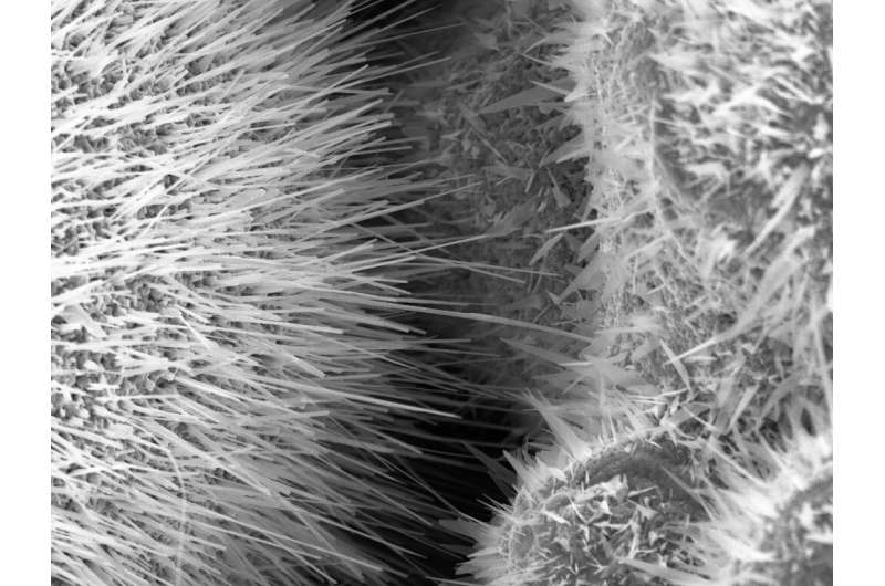 顯微鏡下的傳感器表面:研究小組從金屬微粒中生長出細小的線和尖峰,這些金屬微粒特別擅長捕獲氣體分子。