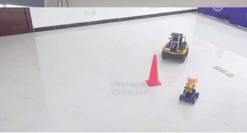 然后,Tianjicat 被編程為跟蹤目標(biāo)并使用來自車載傳感器的數(shù)據(jù)避免撞到障礙物。在這種情況下,目標(biāo)是一個滾動的遙控玩具,頂部固定有一只卡通鼠標(biāo)。研究人員將其稱為貓捉老鼠的挑戰(zhàn)。