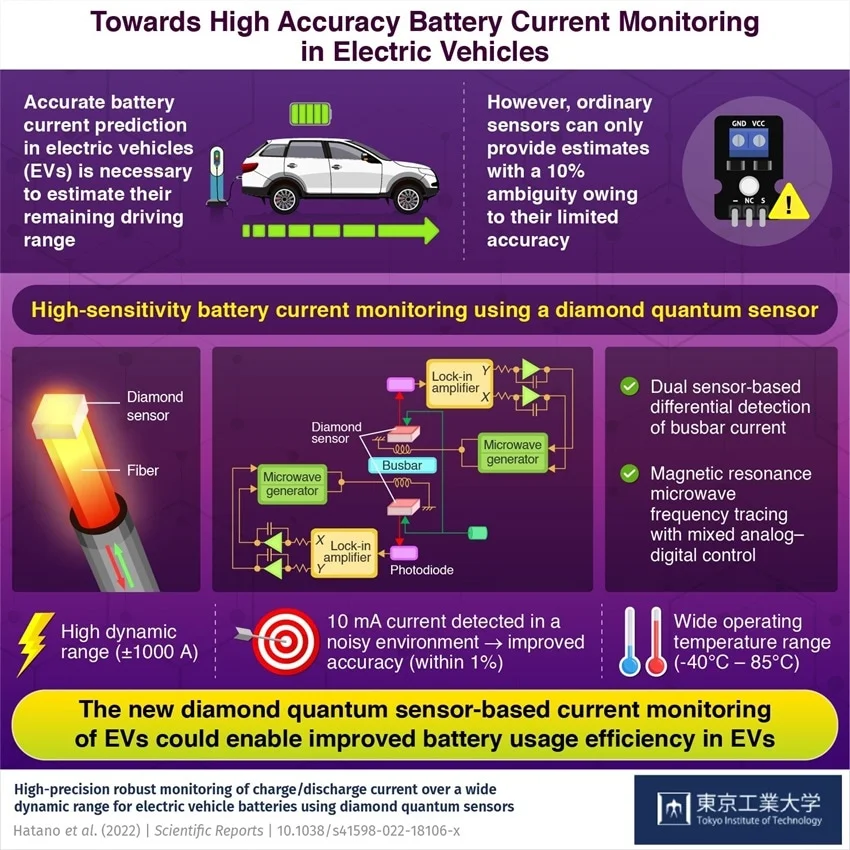 幸運的是,由東京工業(yè)大學(Tokyo Tech)的 Mutsuko Hatano 教授領(lǐng)導(dǎo)的日本研究團隊現(xiàn)在已經(jīng)提出了解決方案。在他們發(fā)表在《科學報告》上的研究中,該團隊報告了一種基于金剛石量子傳感器的檢測技術(shù),該技術(shù)可以在測量電動汽車典型的高電流時以 1% 的準確度估計電池電量。
