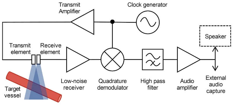 該設(shè)備測量頻移;接收回波的頻率與發(fā)射波束的頻率進(jìn)行比較。頻率變化(稱為多普勒頻移)與朝向或遠(yuǎn)離換能器的運(yùn)動速度成正比。使用這種方法,貼片可以檢測到在兩個光束的重疊體積內(nèi)移動的任何地方的血液。