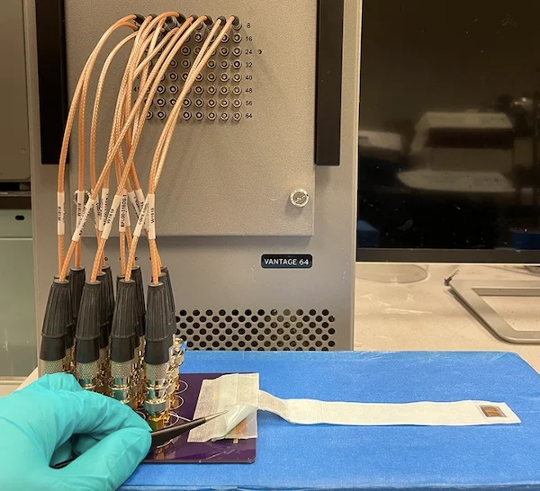超聲波可穿戴設(shè)備連接到其完整的實驗裝置。圖片由UCSD提供