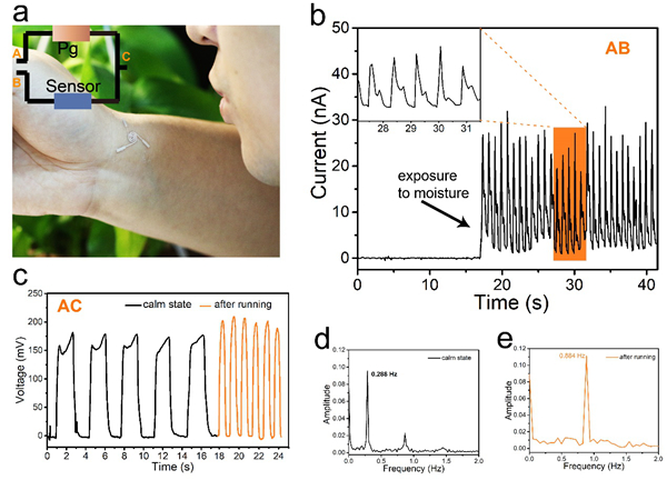 圖4. a.自供能傳感系統(tǒng)貼附于腕部的光學照片。b.自供能傳感系統(tǒng)的實時電流信號,濕度由人吹氣提供,測試連接AB端。c.自供能傳感系統(tǒng)監(jiān)測呼吸。d-e.c圖中時間-電流曲線的傅里葉變換信號。