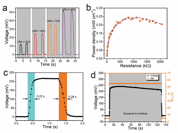 圖3. a. g-PDA柔性自供能器件在ΔRH分別為30%, 50%, 70%,和 90%時產(chǎn)生的開路電壓信號。b. g-PDA自供能器件在不同外接電阻下的有效輸出功率(ΔRH=90%)。c. g-PDA自供能器件對濕氣的響應和恢復時間(ΔRH=50%)。d. g-PDA自供能器件在恒定ΔRH=50%條件下的開路電壓信號。