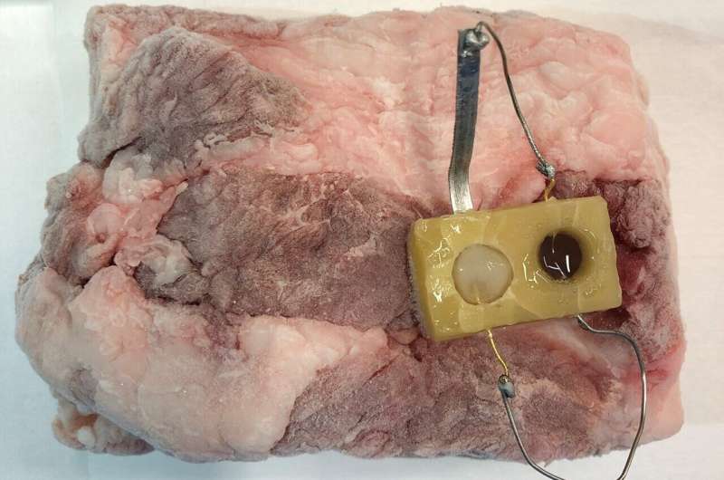由可食用材料設(shè)計(jì)的概念驗(yàn)證傳感器會(huì)產(chǎn)生可見(jiàn)的顏色變化(如右圓圈所示),就像一塊冷凍豬肉解凍一樣。來(lái)源:改編自ACS Sensors 2022,DOI:10.1021/acssensors.2c01280