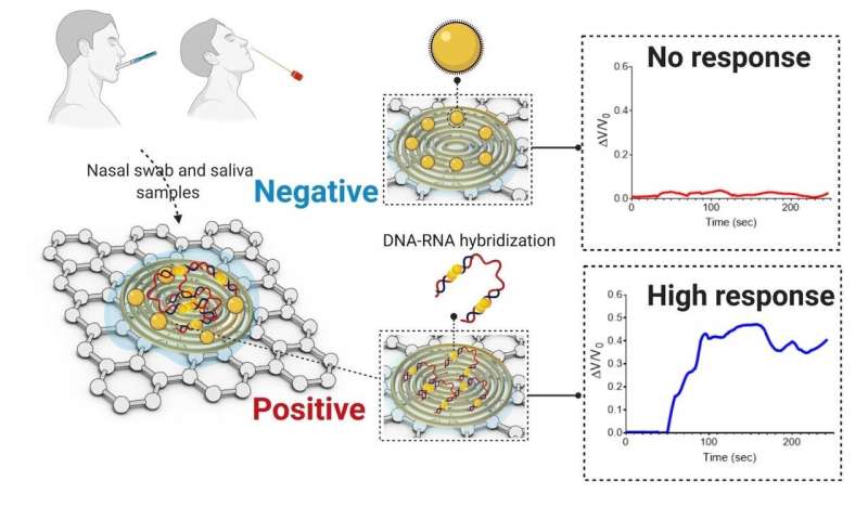 研究人員之前在ACS Nano上發(fā)表的早期工作中展示了所開發(fā)的傳感探針的靈敏度。病毒RNA與這些探針的雜交會(huì)導(dǎo)致傳感器電響應(yīng)的變化。AuNP帽加速電子轉(zhuǎn)移,當(dāng)通過傳感平臺(tái)廣播時(shí),導(dǎo)致輸出信號(hào)增加并指示病毒的存在。
