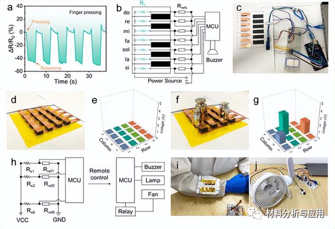 綜上所述,壓阻式傳感器由高彈性3D多孔PU海綿組裝而成,該海綿包裹有導(dǎo)電RGO層,在壓縮過(guò)程中提供導(dǎo)電路徑。當(dāng)受到外部刺激時(shí),導(dǎo)電RGO層中的微裂紋、變形和海綿骨架的接觸會(huì)導(dǎo)致電阻變化,使海綿傳感器具有更高的靈敏度(17.65 kPa–1)和長(zhǎng)期耐用性(8000 次循環(huán))。此后,傳感器可用于準(zhǔn)確檢測(cè)有規(guī)律的人體運(yùn)動(dòng)(例如,手指彎曲、手腕彎曲),或識(shí)別具有不同輸出電信號(hào)的各種重量的物體。此外,集成傳感器陣列和信號(hào)采集電路應(yīng)用于柔性電子鋼琴制造、電子皮膚以及通過(guò)藍(lán)牙技術(shù)遠(yuǎn)程實(shí)時(shí)控制家用電子產(chǎn)品,為柔性電子在智能應(yīng)用場(chǎng)景中提供了可行的嘗試。