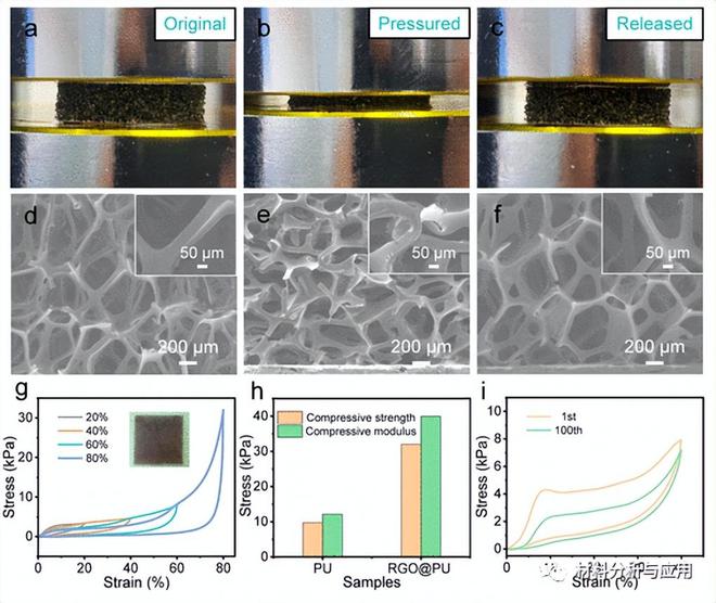 (c) RGO@PU海綿傳感器的傳感機(jī)制的示意圖。