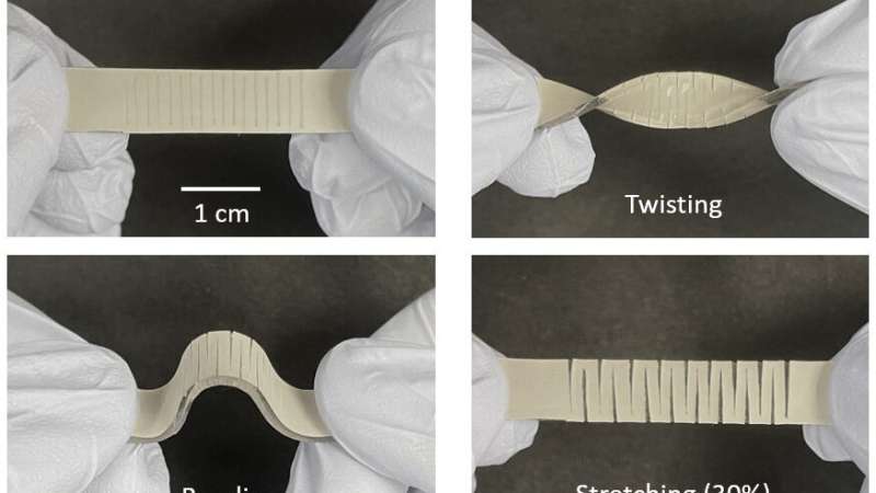 新傳感器由嵌入彈性聚合物中的銀納米線網(wǎng)絡(luò)組成。聚合物具有均勻深度的平行切割圖案,從材料的任一側(cè)交替:從左側(cè)切割一個(gè),然后從右側(cè)切割一個(gè),然后從左側(cè)切割一個(gè),依此類推。