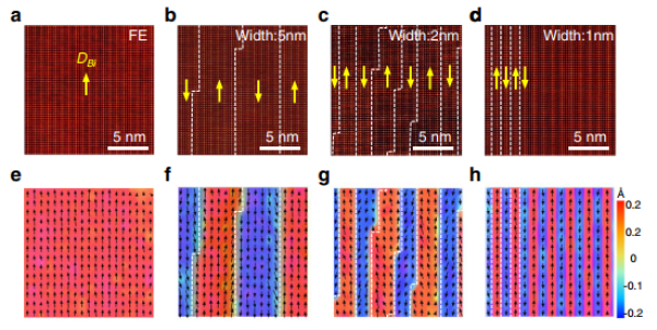 圖3.插層對(duì)疇寬度的調(diào)控及鐵電相到反鐵電相的轉(zhuǎn)變。a-d、具有不同周期的180°疇HAADF-STEM圖像;e-h、分別為對(duì)應(yīng)圖a-d中的離子位移分布。