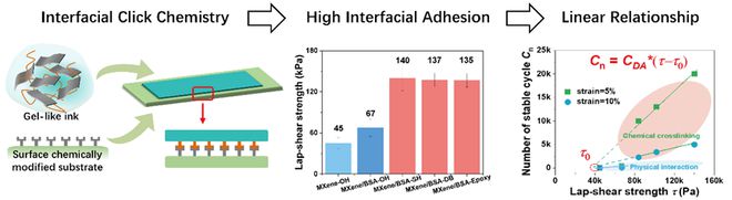 圖2 基于“點擊化學(xué)”構(gòu)建導(dǎo)電層與基底間強界面黏附推動傳感器具有高耐久性。