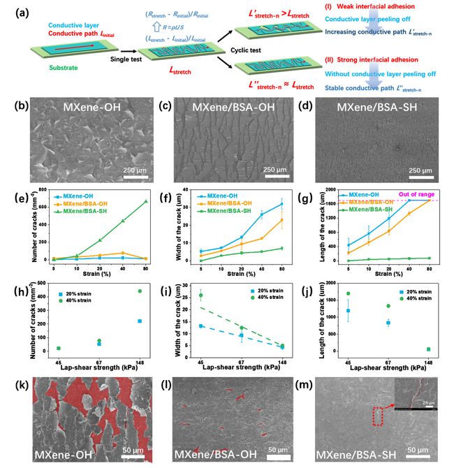 為解釋界面黏附強度影響傳感器耐久性的工作機理,作者針對具有不同界面黏附的傳感器的導(dǎo)電層進行了掃描電鏡表征和分析。圖4表明,隨著界面黏附強度的提升,導(dǎo)電層在固定應(yīng)變下產(chǎn)生的裂痕大小(長度和寬度)減小,但是數(shù)目明顯增多。這種現(xiàn)象是傳感器在保持較高拉伸性的前提下大幅提升拉伸性的原因。在1000次的循環(huán)測試之后,具有較弱界面黏附的傳感器產(chǎn)生了明顯的導(dǎo)電層剝落,而強界面黏附展示了穩(wěn)定的導(dǎo)電層與裂痕維持能力,這是傳感器耐久性提升的根本原因。