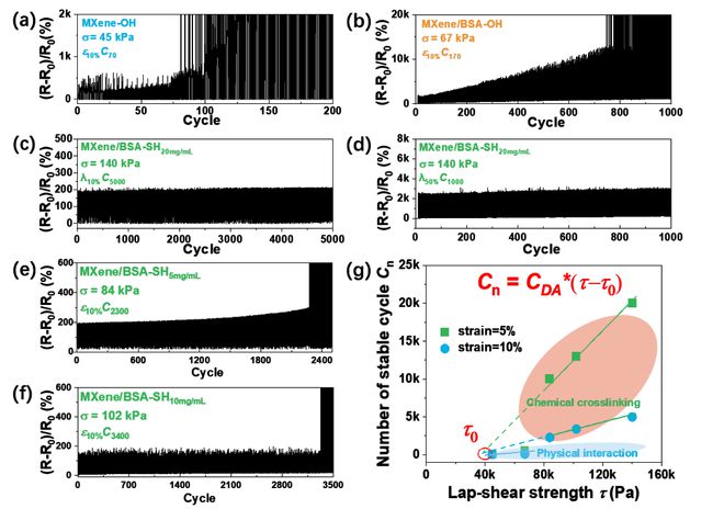 基于“點擊化學(xué)”制備的柔性應(yīng)變傳感器具有可控的界面黏附強度,作者仔細的研究了界面黏附強度與耐久性之間的關(guān)系。首先,作者提出了用于表征耐久性的參數(shù):穩(wěn)定循環(huán)次數(shù) C n,該參數(shù)表示傳感器在固定應(yīng)變下能夠穩(wěn)定輸出電阻信號的次數(shù)。通過調(diào)控界面交聯(lián)密度得到了除界面黏附強度外其他因素皆相同的傳感器,并探索了黏附強度與穩(wěn)定循環(huán)次數(shù)之間的關(guān)系。如圖3所示,隨著界面黏附強度的增加,穩(wěn)定循環(huán)次數(shù)隨之線性增加,并且該線性關(guān)系的斜率與應(yīng)變大小,界面類型等因素都有關(guān),作者推導(dǎo)出二者之間的轉(zhuǎn)換因子"durability-adhesion coefficient ( CDA)”。