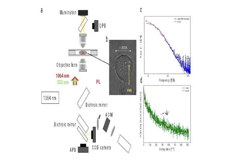研究人員使用光鑷將納米金剛石顆粒捕獲在單個(gè)白血病細(xì)胞內(nèi),然后演示如何使用這些顆粒來(lái)測(cè)量細(xì)胞內(nèi)的磁噪聲。