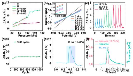 通過調(diào)整打印參數(shù),傳感層具有微點(diǎn)特征的GSCA 3D結(jié)構(gòu)可以提供低于60 ms的快速響應(yīng),并將靈敏度提高32.4%(26-78 kPa)、800%(78-102 kPa)和600%(102-160 kPa)。該傳感器具有11.4 Pa的低檢測(cè)限和較大的檢測(cè)范圍,線性靈敏度為1.4–509 kPa。兩個(gè)相鄰微點(diǎn)之間的蜘蛛腿狀微/納米纖維有助于電子傳輸和氣流傳感。結(jié)果表明,基于石墨烯的點(diǎn)傳感器在識(shí)別空氣強(qiáng)度以及呼吸和氣流方向方面的可行性。GSCA在實(shí)時(shí)個(gè)人監(jiān)控中的進(jìn)一步驗(yàn)證證明了多任務(wù)可穿戴傳感器的潛力。