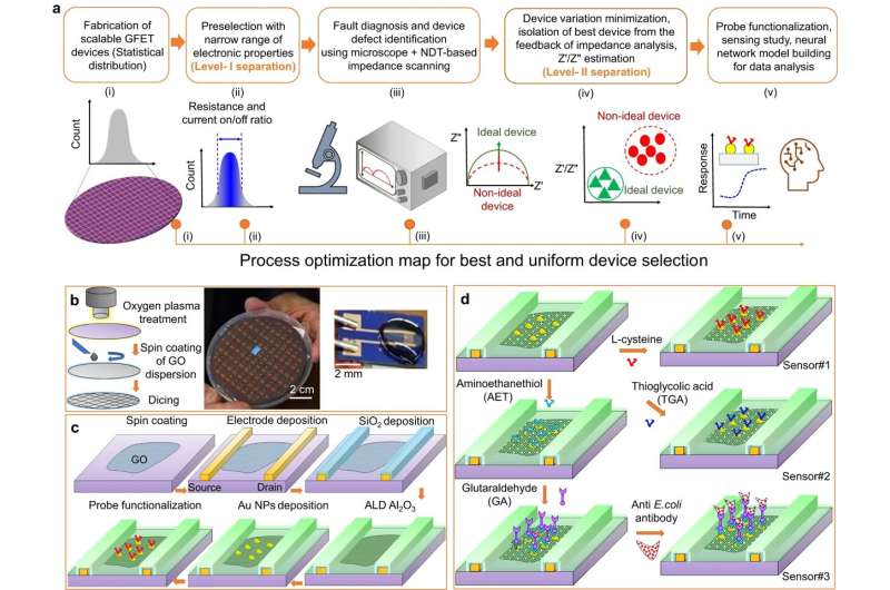 石墨烯基場效應晶體管(GFET)傳感器陣列的晶圓級納米制造和功能化。一種原理圖納米制造策略,使用阻抗測量進行器件預選(故障診斷),以小化器件變化,以實現近乎理想的響應模式。測試/分析程序的每個步驟都示意性地顯示(i-v),并在插圖中附有相應的描述。b 將氧化石墨烯(GO)分散液旋涂到整個晶圓基板上,用于沉積圖案電極。照片顯示了切割后的晶圓尺寸傳感器器件和表面有一滴測試溶液的單個器件。c 基于rGO的FET傳感器器件的納米制造步驟包括通過電子束光刻進行電極沉積,SiO的沉積2使用電子束光刻、3 nm 原子層沉積 (ALD) 衍生的 Al 在電極上的保護層2O3作為頂部柵極氧化物,濺射金納米顆粒(NPs)作為探針的錨定位點,并實現探針功能化。d 傳感器1-3使用特定生化和抗體探針進行探針功能化的示意圖步驟。自然通訊 (2023)。DOI: 10.1038/s41467-023-39701-0