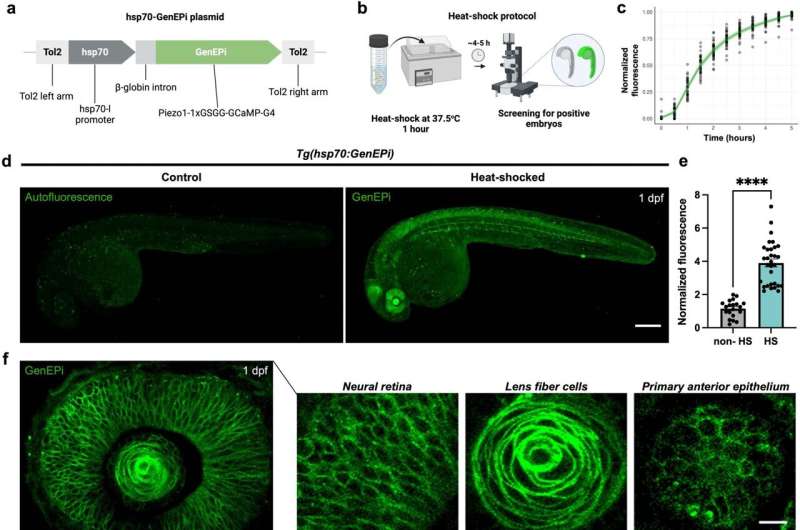 為了對這些通道進行成像,由Periklis Pantazis博士領(lǐng)導(dǎo)的帝國理工學(xué)院研究人員開發(fā)了一種高度特異的生物傳感器GenEPi,當(dāng)Piezo1通道被激活時,它會在顯微鏡下發(fā)光。他們在細(xì)胞和整個生物體水平上測試了GenEPi,成功地突出了Piezo1在人類腎臟、包皮、宮頸癌細(xì)胞、跳動的小鼠心臟細(xì)胞和整個斑馬魚胚胎中的活性。