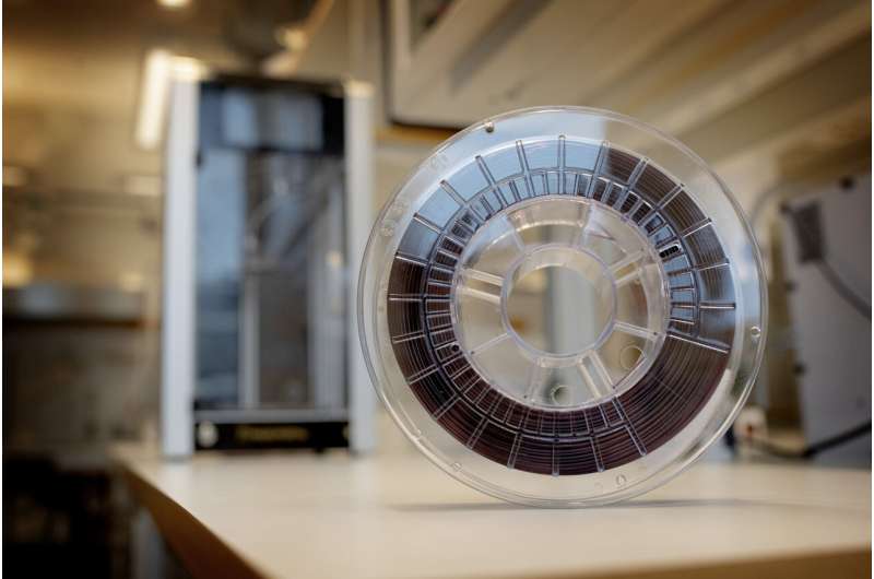 等離子體塑料的細(xì)絲。由于其柔韌性,該材料幾乎可以形成任何形狀。在這個(gè)特定示例中,燈絲旨在用于3D打印機(jī)。學(xué)分:查爾默斯/馬林·阿內(nèi)森