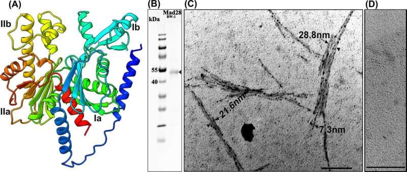 (A) Alphafold預(yù)測的BW-28的Mad1三維結(jié)構(gòu)模型。結(jié)構(gòu)中標(biāo)明了四個肌動蛋白結(jié)構(gòu)域 Ia、Ib、IIa 和 IIb。(B) 純化的 N 端 His 標(biāo)簽的 Mad28 的 SDS-PAGEBW-1型來自大腸桿菌。(C)Mad28的體外聚合BW-1型在存在 ATP-γ-S 且沒有 ATP (D) 的情況下,通過 TEM 可視化。比例尺,100 nm。圖片來源:mBio (2023)。DOI: 10.1128/mbio.01649-23