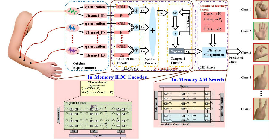 針對(duì)這一問題,微電子所微電子器件與集成技術(shù)研發(fā)中心劉明院士團(tuán)隊(duì)的尚大山研究員與香港大學(xué)合作,基于阻變存儲(chǔ)器(RRAM)的存內(nèi)計(jì)算范式,開發(fā)了面向時(shí)空信號(hào)處理的存內(nèi)高維計(jì)算編碼技術(shù)。團(tuán)隊(duì)采用2T2R(兩個(gè)晶體管與兩個(gè)RRAM為一個(gè)單元)陣列作為存內(nèi)高維計(jì)算的編碼器,通過在編碼器中原位執(zhí)行綁定和捆綁操作,并通過設(shè)計(jì)簡(jiǎn)單的外圍電路進(jìn)行重排操作,實(shí)現(xiàn)了對(duì)時(shí)空信號(hào)的編碼。該方法利用電阻分壓原理映射超向量的元素,避免了矩陣—向量乘法過程中的陣列會(huì)聚電流過大的問題。此外,團(tuán)隊(duì)采用1T1R陣列作為關(guān)聯(lián)記存儲(chǔ)器。在訓(xùn)練階段,每個(gè)類別編碼后的超向量通過疊加構(gòu)成該類的原型向量,并預(yù)先存儲(chǔ)至關(guān)聯(lián)記憶存儲(chǔ)器中。在推理階段,輸入的時(shí)空信號(hào)首先被編碼為查詢超向量,然后以存內(nèi)搜索的方式與關(guān)聯(lián)記憶存儲(chǔ)器中的類原型向量進(jìn)行相似度計(jì)算。具有最大相似度的類即為預(yù)測(cè)結(jié)果。該設(shè)計(jì)在基于腦肌電信號(hào)的手勢(shì)識(shí)別任務(wù)中實(shí)現(xiàn)了97.96%的識(shí)別率。40nm工藝節(jié)點(diǎn)仿真結(jié)果表明該設(shè)計(jì)具有高魯棒、高通量、低延時(shí)等優(yōu)勢(shì),同時(shí)計(jì)算能效相較于當(dāng)前的已報(bào)道的高維計(jì)算編碼器提升了39倍。這項(xiàng)研究結(jié)果為在資源有限的邊緣系統(tǒng)實(shí)現(xiàn)對(duì)時(shí)空信號(hào)的實(shí)時(shí)處理提供了一種高效的解決方案。