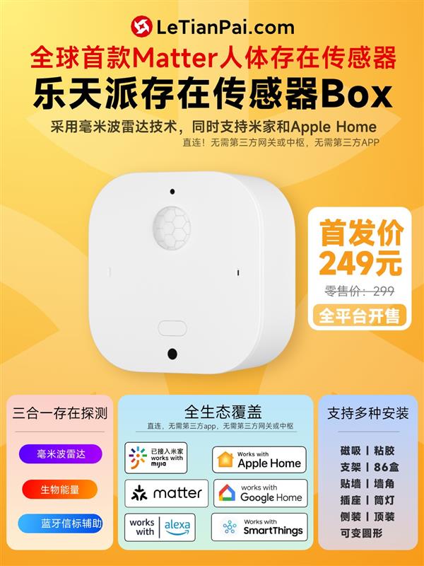 樂天派公司作為國內(nèi)Matter智能家居企業(yè),推出了全球首款Matter人體存在傳感器“樂天派人體存在傳感器Box”,采用毫米波技術(shù),填補(bǔ)了 Matter 人體存在傳感器設(shè)備品類的空白,并且同時支持米家和 Apple Home、Amazon Alexa、Google home等多生態(tài)接入,可以實(shí)現(xiàn)、同時、實(shí)時全雙工運(yùn)行,接入無需第三方網(wǎng)關(guān)和中樞,也無需第三方APP。