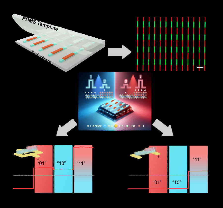 中國科學(xué)院化學(xué)研究所綠色印刷院重點實驗室宋延林課題組開展了可控印刷多維度、多功能微納傳感器件等方面的研究,并取得了進(jìn)展。近期,該課題組利用模板輔助連續(xù)印刷策略可控制備鈣鈦礦異質(zhì)結(jié)構(gòu)陣列,并實現(xiàn)光控邏輯運算。該策略印刷制備MAPbBr3陣列,進(jìn)而在預(yù)成型MAPbBr3陣列和模板的協(xié)同誘導(dǎo)作用下,在MAPbBr3陣列的特定位點處精準(zhǔn)印刷構(gòu)筑MAPbI3異質(zhì)區(qū)域。在異質(zhì)區(qū)域的引入過程中,該研究通過精準(zhǔn)調(diào)控MAPbI3前驅(qū)體溶液中DMF/MAAc二元溶劑的比例和濃度,避免該過程對預(yù)成型MAPbBr3陣列的損傷,并抑制瑞利失穩(wěn)效應(yīng),改善MAPbI3的結(jié)晶質(zhì)量,從而制備具有多異質(zhì)區(qū)域且形貌均勻可控的MAPbBr3-MAPbI3異質(zhì)結(jié)構(gòu)陣列。MAPbBr3-MAPbI3異質(zhì)結(jié)構(gòu)的不同區(qū)域可以對不同波長的入射光展現(xiàn)出不同的邏輯態(tài)。該工作結(jié)合電極設(shè)計,在單個鈣鈦礦異質(zhì)結(jié)構(gòu)單元上實現(xiàn)了“與”和“或”邏輯門,并在鈣鈦礦異質(zhì)結(jié)構(gòu)陣列上以100%的準(zhǔn)確率實現(xiàn)了相應(yīng)的邏輯操作。