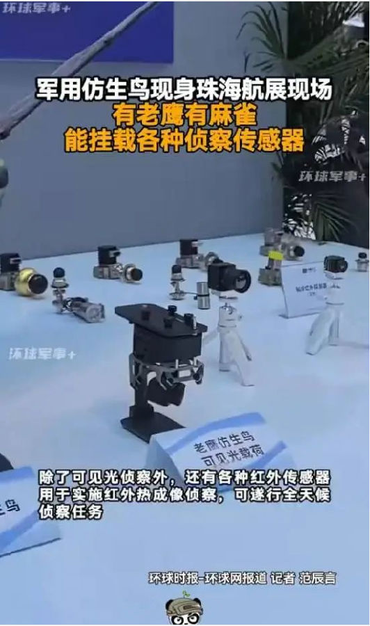 軍用仿生鳥:在珠海航展現(xiàn)場的“中國軍工”展區(qū),展出了許多軍用仿生鳥及其配套的各種傳感器。它們之中有老鷹有麻雀,能掛各種偵察傳感器。這種形態(tài)逼真的仿生鳥在執(zhí)行隱蔽偵察任務中,撲翼無人機在空中盤旋,對手可能根本無法意識到自己正處于監(jiān)視中,猶如好萊塢電影中的畫面。