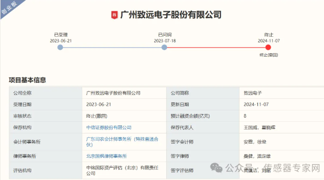隨著經(jīng)濟環(huán)境的變化和金融政策的收窄,2024年以來,已有多家傳感器企業(yè)IPO終止。 11月7日,深圳證券交易所公告顯示,又有一家中國傳感產(chǎn)業(yè)鏈知名企業(yè)——廣州致遠(yuǎn)電子股份有限公司(下文簡稱“致遠(yuǎn)電子”)IPO終止。 從上市信息看,致遠(yuǎn)電子于2023年6月21日向深交所提交IPO申請獲受理,2023年7月18日獲問詢,并于2024年11月7日終止IPO審核,終止原因為“廣州致遠(yuǎn)電子股份有限公司、保薦人撤回發(fā)行上市申請”。本次致遠(yuǎn)電子IPO的保薦機構(gòu)