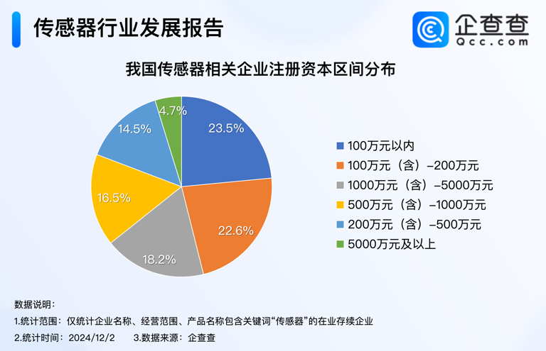 注冊資本方面,數(shù)據(jù)顯示我國傳感器相關企業(yè)以中小規(guī)模為主。其中,注冊資本在100萬元以內的企業(yè)占比最高,達到23.5%,注冊資本在100萬元至200萬元之間的企業(yè)緊隨其后,占比22.6%。綜合來看,注冊資本在200萬元以內的企業(yè)合計占比46.1%,成為主流。注冊資本在1000萬元至5000萬元之間的企業(yè)也占據(jù)一定比例,達到18.2%。