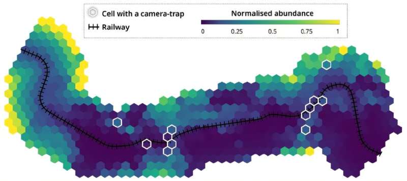 最后,將處理后的數(shù)據(jù)輸入到豐度模型中,這是另一種類型的生態(tài)模型。它用于使用僅在該區(qū)域中的幾個(gè)點(diǎn)收集的數(shù)據(jù)來(lái)估計(jì)研究區(qū)域每個(gè)部分的動(dòng)物可能密度。結(jié)果是一張地圖,其中顯示了物種的相對(duì)豐度,因此,顯示了基礎(chǔ)設(shè)施沿線的碰撞風(fēng)險(xiǎn)。