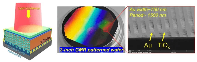 本研究中提出的集成在導(dǎo)模共振(GMR)結(jié)構(gòu)上的銦鎵砷光電二極管圖像傳感器示意圖(左)、制造出的晶圓照片以及周期性圖案的掃描電子顯微鏡(SEM)圖像(右)。圖片來源:韓國科學(xué)技術(shù)院