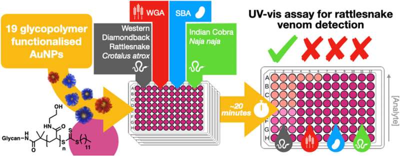 為開發(fā)針對(duì)該蛇毒的檢測(cè)試驗(yàn),研究團(tuán)隊(duì)設(shè)計(jì)了模擬毒液蛋白靶向的天然糖受體的合成糖鏈(糖聚合物),并將其連接到金納米顆粒上以放大反應(yīng)信號(hào)并可視化 —— 當(dāng)毒液毒素與合成糖結(jié)合時(shí),檢測(cè)試劑會(huì)發(fā)生顏色變化。