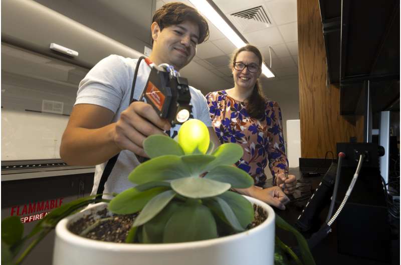 作物、土壤與環(huán)境科學系碩士研究生馬里奧・索托(左)和農業(yè)分部及戴爾・邦珀斯農業(yè)、食品與生命科學學院精準農業(yè)助理教授奧雷莉・龐塞,展示了一項用于測量除草劑對植物有效性研究的設備。圖片來源:阿肯色大學系統(tǒng)農業(yè)分部