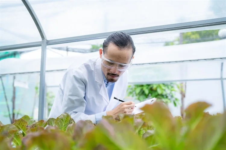一位戴著護(hù)目鏡、穿著白色實(shí)驗(yàn)服的男性科學(xué)家正在觀察植物,并用筆做記錄。