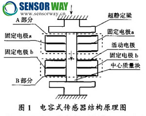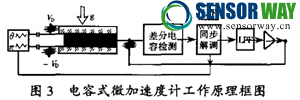 硅微電容式加速度計的工作原理如圖3所示。 在受到加速度作用時,在慣性力-作用下,檢測 質(zhì)量塊在z方向運動。這使動極板兩側(cè)的電容Ca、 Cb發(fā)生了變化。兩側(cè)電容的差值(2倍于單側(cè)的變 化量)經(jīng)激勵正弦波信號調(diào)制,由電容檢測器檢出。
