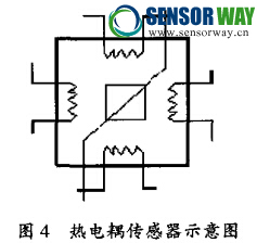 硅微熱電耦式的加速度傳感器目前多應(yīng)用于低 成本的傳感器領(lǐng)域,此類加速度傳感器既可以測量 動態(tài)加速度,也可以測量靜態(tài)及速度;跓峤粨Q 原理,介質(zhì)是氣體。如圖4所示,熱源處于硅片的中 央,硅片懸在空穴中間。在熱源的四周均勻分布有 熱電耦堆(鋁/多晶硅h圖中的加速度傳感器上有 兩路信號,一路是測量X軸加速度的,另一路是測 量3"軸加速度的。在沒有加速度的情況下,熱源的 溫度梯度均勻分布,對四周的熱電耦而言,溫度是一 樣的,輸出的電壓也是一樣的。熱自由交換,任何方 向的加速度將打破溫度分布平衡,使之分布不平衡。 輸出的電壓也將隨之改變。熱電稱輸出的電壓差和 加速度成正比例。