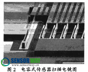 硅微電容式加速度傳感器的敏感部分通常為梳齒結(jié)構(gòu),如圖1所示,其掃描電鏡顯微照片如圖2所示。敏感元件由活動部分A、B和固定電極三部分 組成。其中,活動部分由超靜定梁、質(zhì)量塊以及與質(zhì) 量塊相連的活動電極組成。整個梳齒結(jié)構(gòu)分成A和B兩部分,固定電極分成固定電極ti和固定電極 W固定電極a與上半部分活動電極組成電容Ca, 固定電極b與下半部分活動電極組成電容設(shè) 計時,將上、下極板不同區(qū)域的電極的引線分開,實驗時,可根據(jù)需要將其短接或分開接。當(dāng)有加速度 A輸人時,慣性力使活動極板產(chǎn)生1個偏角α使電容器C1的電容量增加,C2的電容量減小,通過線 路轉(zhuǎn)換,把電容器C1、C2的電容量轉(zhuǎn)換成電信號, 經(jīng)相敏放大后把輸出電壓反饋到電容靜電力矩器,電容力矩器產(chǎn)生的靜電力矩與慣性力矩平衡,使式中: