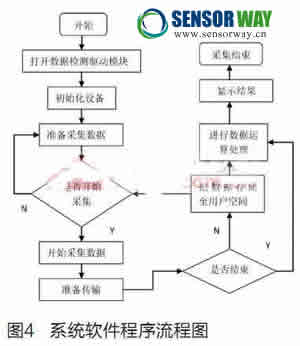 軟件系統(tǒng)實現的功能有兩個:一個是數據檢測采集,主要負責傳感器的數據檢測、采集和控制;另一個為采集數據的處理及人機顯示,包括信號處理算法實現和數據存儲,人機界面負責LCD驅動和文字圖形的顯示。操作系統(tǒng)首先通過設備驅動模型對傳感器進行初始化,為傳感器設置合適的配置參數,以使設備能在采集過程中正確工作;上層圖形系統(tǒng)采用嵌入式GUI來實現人機交互界面,包括圖形控制面板建立、波形顯示、參考值顯示等。軟件流程如圖4所示。