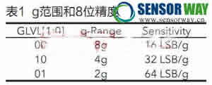 MMA7455L測量模式下會連續(xù)的測量三軸加速度,并根據g-select配置情況對外提供測量結果。當測量轉換完成后,DRDY輸出高電平,表明“測量數據已OK”,DRDY狀態(tài)也可在狀態(tài)寄存器(0x09)的DRDY位來監(jiān)測,DRDY引腳一直保持高電平直到三個測量值的其中一個被讀出,因此可能會產生數據被下一個測量值覆蓋問題,若下一個測量值在前一個數據讀出前就寫入的話,狀態(tài)寄存器的DOVR位會被置位。在MMA7455L中,g-select由模式控制寄存器(0x16)的2個GLVL位確定,見表1。內部增益控制器根據所選g來提供不同的測量靈敏度以適應不同的應用需求,船舶的振動檢測在MMA7455L中選擇8g范圍即可。