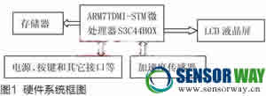 船舶振動檢測系統(tǒng)的工作原理是,系統(tǒng)通過操作系統(tǒng)來調度任務,當有檢測任務時,系統(tǒng)初始化檢測傳感器,并根據檢測方式配置參數,采集數據后進行存儲和計算,并可存儲測試數據和實時顯示測試結果,LCD顯示精巧的人機圖形界面。本系統(tǒng)的硬件實現框圖如圖1所示。