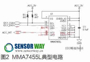 系統(tǒng)核心硬件部分為ARM控制器、加速度傳感器、flash存儲器、鍵盤、液晶顯示和USB接口等。其中加速度傳感器部分采用飛思卡爾公司的MMA7455L來實現,傳感器部分電路圖如圖2示。