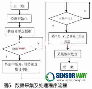 數據采集及處理部分的程序流程如圖5所示。其中檢測初始化包括檢測模塊上電,I/O控制端口初始化、加速度傳感器的初始化;加速度傳感器需要零點校準和自檢測以滿足精度要求;系統(tǒng)調用檢測任務后,外部中斷打開,等待加速度傳感器的中斷上報及檢測數據采集。