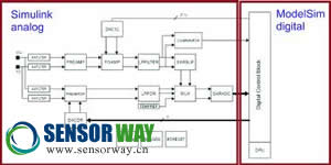 確定磁場之后是傳感器系統(tǒng)仿真。AMR 元件的電阻變化是各向異性磁阻效應(yīng)的直接結(jié)果。這樣,磁場仿真的結(jié)果會(huì)導(dǎo)致代表信號(hào)處理中輸入信號(hào)的電阻發(fā)生變化。對模擬前端進(jìn)行建?刹捎 Simulink。這種行為模型是概念設(shè)計(jì)的產(chǎn)物,標(biāo)志著產(chǎn)品開發(fā)的起點(diǎn)。每個(gè) Simulink 塊對應(yīng)一個(gè)模擬信號(hào)處理組件,例如放大器或過濾器。但是,尚未考慮模擬組件的控制部分,這由數(shù)字系統(tǒng)實(shí)現(xiàn)。HDL 設(shè)計(jì)則仿真通過數(shù)字方法實(shí)現(xiàn)的功能,而且在完成產(chǎn)品開發(fā)之后就會(huì)最終成形。因此,整體系統(tǒng)仿真是 Simulink 對模擬組件的行為模型以及ModelSim 對 HDL 設(shè)計(jì)的共同仿真(圖8)?赏ㄟ^仿真從概念階段順利過渡到HDL 設(shè)計(jì)及后續(xù)階段。在共同仿真中,可用 ModelSim 中部署的 Verilog 代碼逐漸代替 Simulink 參考模型,從而可逐項(xiàng)驗(yàn)證 HDL 設(shè)計(jì)?沙掷m(xù)進(jìn)行此過程,直到在 Verilog 中實(shí)現(xiàn)整個(gè)數(shù)字部件,而模擬系統(tǒng)部件仍保持為 Simulink模型。此工具組合也已證明對 IC 評估同樣有用。自始至終使用這種工具可以更容易理解 IC 行為,并可創(chuàng)建用來分析和解釋任何錯(cuò)誤的框架。這些工具的主要好處在于,能夠更快速、更準(zhǔn)確地答復(fù)客戶的查詢,以及更好地了解與環(huán)境條件相關(guān)的傳感器功能。