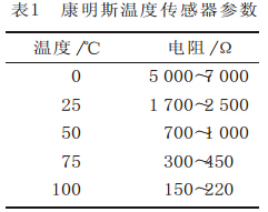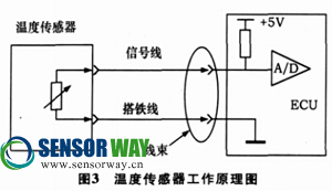 電控柴油發(fā)動(dòng)機(jī)上使用的溫度傳感器為二線(xiàn)式熱敏式溫度傳感器, 其外形如圖2所示。隨著溫度的升高, 熱敏電阻的阻值降低, 正常情況下阻值在500Ω~40kΩ之間變化, 表1所示為一個(gè)典型的康明斯溫度傳感器參數(shù), 具體參數(shù)值請(qǐng)參照隨電路圖提供的傳感器技術(shù)參數(shù)表。圖3為溫度傳感器的工作原理圖。隨著溫度的升高, 熱敏電阻值降低, 從而使信號(hào)電壓降低, 根據(jù)溫度傳感器的工作原理, 可以用檢查熱敏電阻阻值的方法檢查溫度傳感器, 通過(guò)對(duì)比實(shí)際測(cè)量所得的電阻值和參數(shù)表中的電阻值, 來(lái)判斷溫度傳感器是否正常。