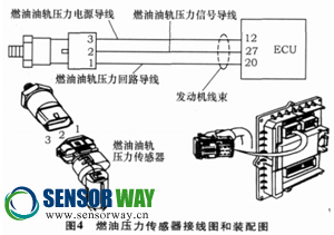 康明斯發(fā)動(dòng)機(jī)上使用的壓力傳感器有2種: 一種是電容式壓力傳感器; 另外一種是壓電晶體式傳感器。2種傳感器均為3線(xiàn)式, 2根電源線(xiàn)向傳感器提供5V的工作電壓, 1根信號(hào)線(xiàn)向ECU提供壓力信號(hào)電壓。燃油壓力傳感器接線(xiàn)圖和裝配圖如圖4所示。