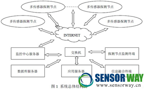 整個分布式多傳感器信息融合系統(tǒng)由若干個不規(guī)則分布的多傳感器探測節(jié)點、 INTERNET 網(wǎng)絡(luò)、監(jiān)控中心服務器、交換機、數(shù)據(jù)庫服務器、應用服務器、多傳感器信息 融合終端和探測節(jié)點控制終端等組成,其總體結(jié)構(gòu)如圖1 所示。
