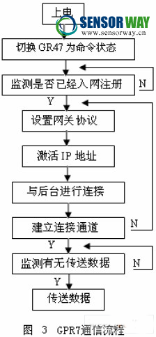 本系統(tǒng)采用了第二種方式獲得本身 IP,而后臺監(jiān)控中心 服務器的IP 是固定的。采用GPRS 模塊上網(wǎng)時,GPRS 模塊 首先完成撥號登陸,然后進行數(shù)據(jù)傳輸。實現(xiàn)動態(tài)IP 方式 上網(wǎng)通信的處理流程如圖3 所示。