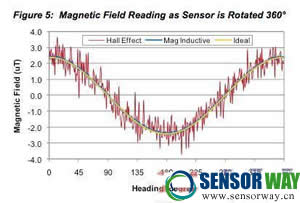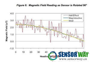 下圖顯示了地磁傳感器在磁場強(qiáng)度為2.4mT數(shù)量級的固定位置旋轉(zhuǎn)時輸出的磁場讀數(shù)。在圖5中,傳感器旋轉(zhuǎn)了整整360°,而在圖6中,傳感器從0°旋轉(zhuǎn)到90°。這兩張圖都繪出了霍爾效應(yīng)傳感器、永磁感應(yīng)傳感器和理想傳感器的試驗數(shù)據(jù)。