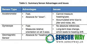 如前所述,加速度計、陀螺儀和地磁傳感器每個都有各自的優(yōu)缺點(diǎn)。下表1總結(jié)了每種傳感器在運(yùn)動跟蹤方面的主要優(yōu)勢和問題。